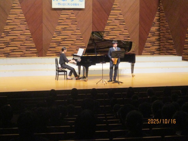 今回は、サクソフォン奏者をお招きし、当校の音楽教諭とともに演奏しました。
