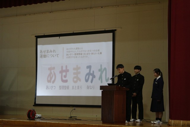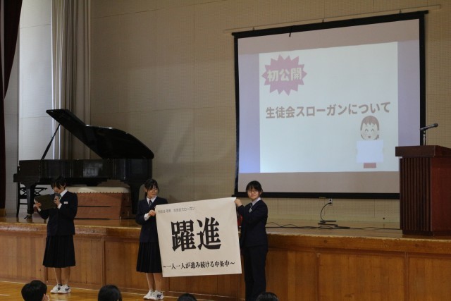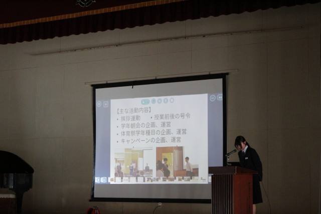 生徒会三役の紹介、スローガンの紹介、各専門委員会の内容説明を行いました。