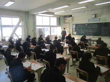 今日と12日の2日間に分け、1・2年生の定期テストが実施されています。1教科目のテストの様子です。3年生は、グループで教え合いながら入試対策問題に取り組んでいます。