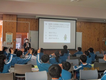2年生の総合的な学習の時間にフリーランスティーチャー・国際教育研究会の関さんからお越しいただき、これからの未来を築いていく一員として、持続可能な開発についてみんなで考えました。また、自分たちが世界の中で、いかに恵まれた環境を与えられているのかを実感することができました。