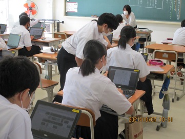 今日の3時間目の授業です。1年生と3年生の数学ではそれぞれ1次方程式と2次方程式の課題をグループで教え合いながら解いていました。2年生の国語では、タブレットを使用して、意見交換を行っていました。