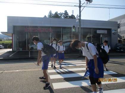 生徒たちは元気よく登校しています。学校前の横断歩道でも、1学期同様に、停車してくれた車に対してお礼をしている姿から始まりました。2学期もこれまで同様にいきましょう。