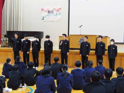 11月20日(月)朝、生徒朝会を行いました。内容は、県駅伝競走大会の報告、表彰伝達、生徒会役員選挙の立候補者の自己紹介でした。