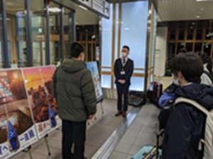 飯山駅のお取り計らいで、電車の情報を知らせる電光掲示板に、「中条中学校の皆さん、おかえりなさい」とメッセージを流していただきました。