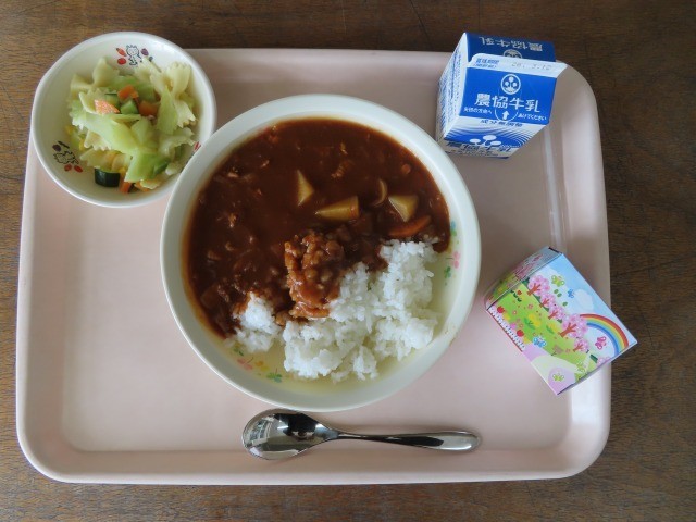 ちなみに今日のメニューは、ハヤシライス、春色サラダ、牛乳、お祝いケーキでした。