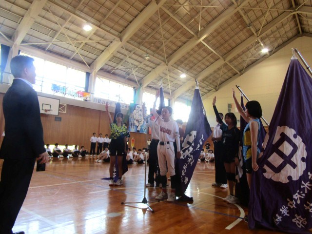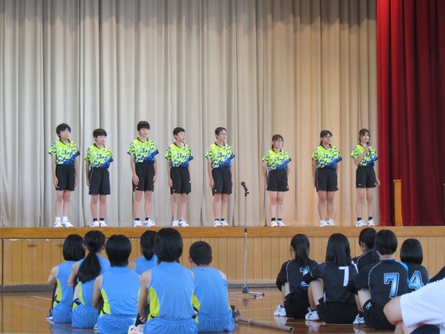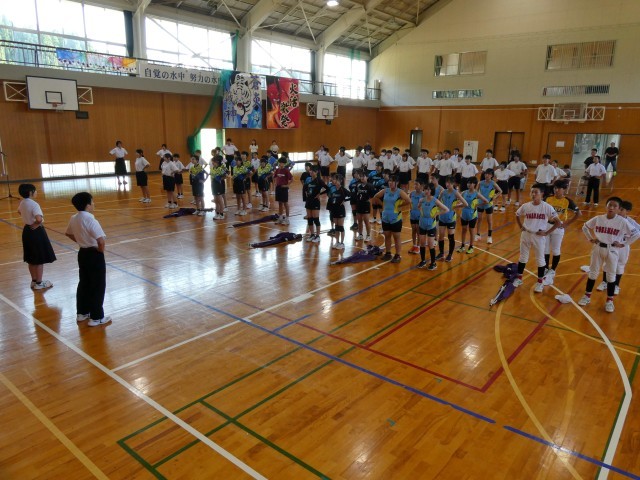 新人各種大会激励会を、体育館で放課後に行いました。開会の言葉の後、各部がステージにかけ上がり、選手の参加種目やポジションなどとともに大会に向けての決意表明がありました。その後、生徒会激励の言葉と校長激励の言葉があり、選手宣誓、激励応援と続きました。選手は、緊張しつつもしっかりとした態度でステージに上がっていました。また、全校応援の声も力強く気持ちが入っていました。選手の健闘を祈っています。