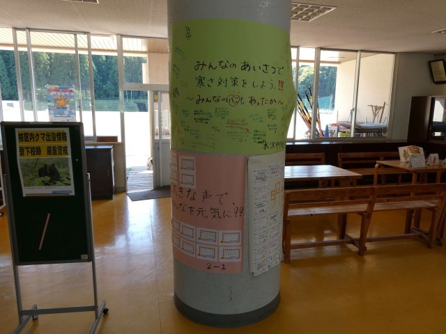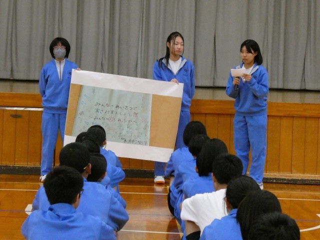 15日(水)から行われる、小中Pあいさつ交流に向けて、全校集会がありました。学年のスローガンと意気込みが発表され、玄関ホールにスローガンと各自の意気込みが貼られました。小学生の手本となるあいさつをして、地域の皆さんを元気にしてほしいです。