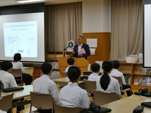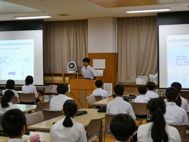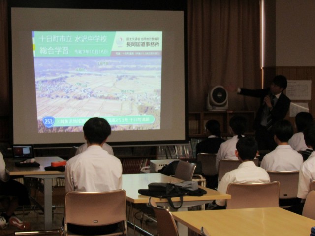 2限にランチルームで全校総合学習を行いました。水沢地区インター推進協議会の皆様や長岡国道事務所、十日町市都市計画課の皆様から来校していただき、十日町IC周辺の活用方法などについて、ご説明をいただきました。生徒は真剣な態度で話を聞いていました。今後は、水沢地区、そして十日町のさらなる魅力を引き出せるようにアイディアを考え発表する予定です。