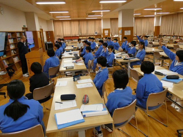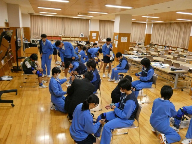 3年生は、総合の時間に福祉体験学習を行いました。新潟県介護福祉会の介護福祉士の方を講師にお迎えして、講話を聞いた後に体験活動をしました。「高齢者を体験しよう」では、重りの入ったベストを着て、手足にも重りを付け、肘とひざにサポーターを巻き、前かがみベルト、ゴーグル、イヤーマフを装着して階段の上がり下りを体験しました。生徒は、この学習を通して福祉課題に対して自分がどのようにかかわっていくかを考えていました。
