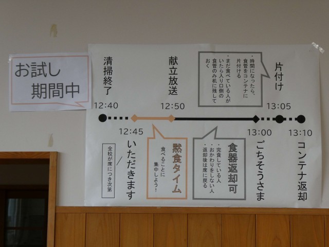 1学期末に行った学校評価の御意見を受けて、子どもたちが給食を食べる時間を確保するために現在お試し期間中です。黙食タイムを設けたり、食器の返却方法を工夫したりしてみた結果を基に今後、検討していきます。