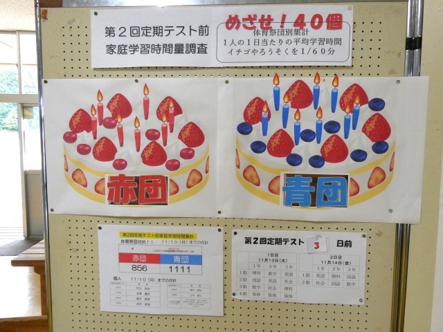 生徒玄関前に、ケーキが掲示されています。これは明後日1113日と14日に行われる第2回定期テストに向けて、家庭学習量調査のための掲示です。第1回定期テストは、部活動対抗で宝箱に1日の家庭学習時間の平均が1時間に1金貨が貼られる掲示でした。今回は、体育祭の団対抗でケーキにろうそくなどが貼られていくようです。今のところ、青団がリードしています。学力向上に向けて、全校で学習への雰囲気を高めていきましょう。