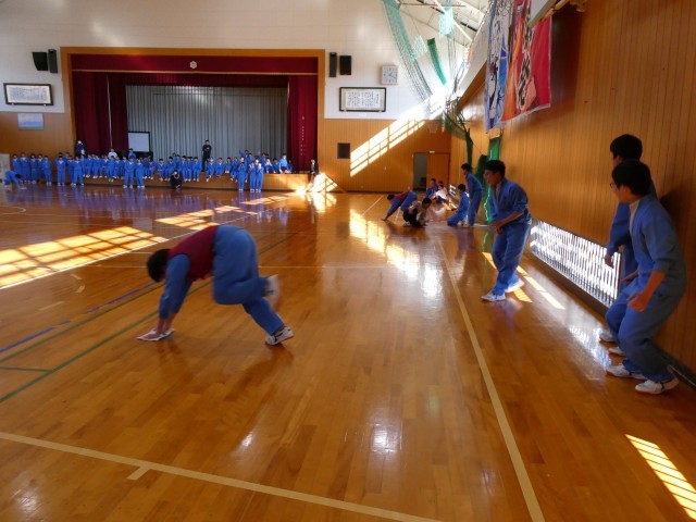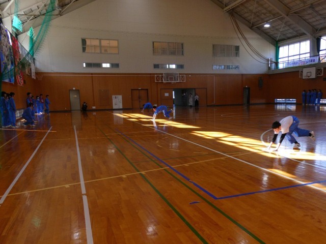 整備委員会のニコニコWeeks企画「雑巾がけリレー」が、昼休みに体育館でありました。各クラス男女6名ずつの代表により、体育館を往復してリレーが行われました。最初に女子の部、次に男子の部、そして、急きょ男女混合の部が行われ、白熱した戦いが繰り広げられました。大きな声で声援を送る級友と、それに応えるように雑巾がけで疾走する代表生徒の奮闘がほほえましい光景でした。