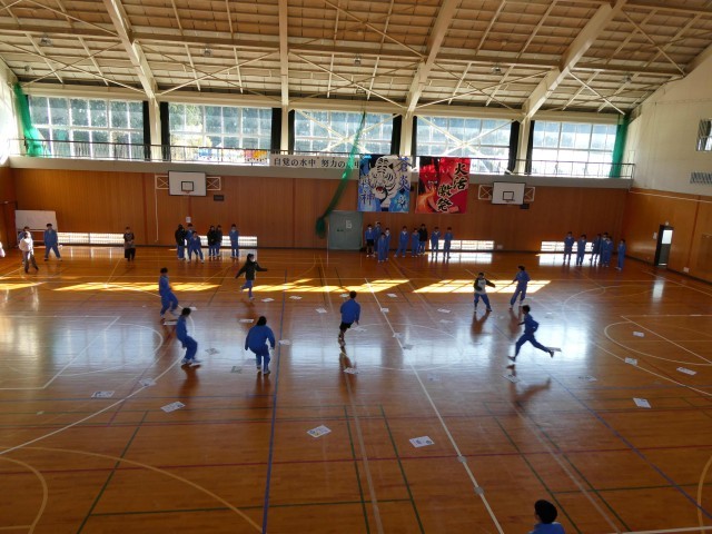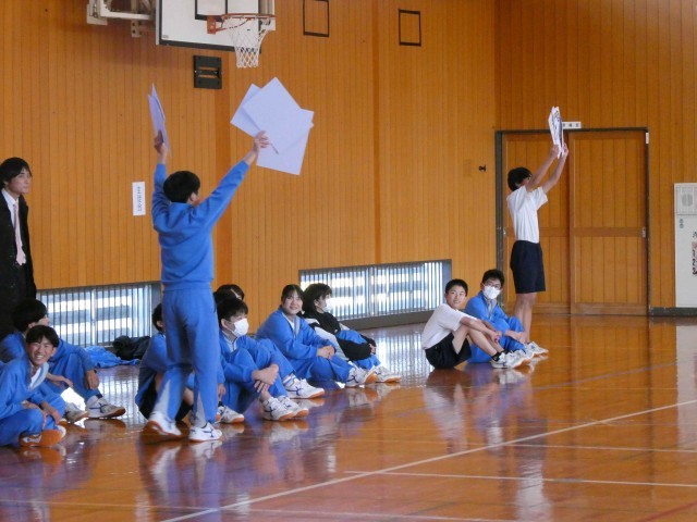 昼休みに保健委員会のニコニコWeeks企画「健康かるた大会」が体育館でありました。健康に関する巨大かるたを、委員会対抗で取り合いました。保健委員が読み札を交代して読み上げ、各委員会の代表者が体育館を走って取り札を探す様子が楽しそうでした。委員会の絆を深められる楽しい活動でした。