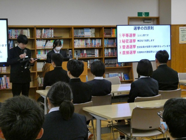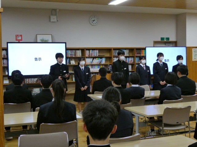 今朝は、ランチルームで全校朝会を行いました。校長講話では、「掃除は心もきれいにする」という話をしました。禅の教えでは、「掃除は単に労働ではなく、心を磨く行為」とされることや、偉人、聖人の掃除に関する言葉を紹介しました。また、卓球の入賞者や体力テストの優秀者、英語検定合格者を全校で称えました。その後、選挙管理委員会の紹介と令和8年度の生徒会役員選挙の告示がありました。