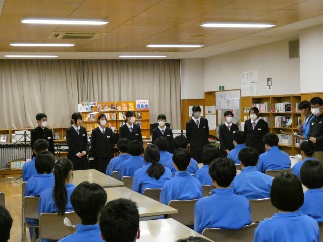 放課後に、吹奏楽部のアンサンブルコンテストでの活躍を祈念して、ランチルームで激励会を行いました。1年生5重奏と2年生3重奏の2チームでの参加のため、それぞれが決意表明と演奏を披露しました。長岡市立劇場で思う存分力を発揮することを願っています。