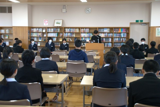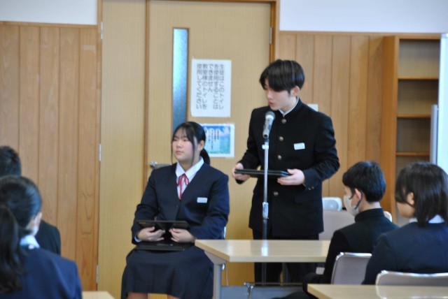 今朝は、臨時で1・2年生の合同朝会がありました。この会は、先日生徒会役員選挙で選ばれた新生徒会正副会長が進行をしました。内容は、3年生の生徒会本部役員、専門委員長から、1・2年生に向けて、役職の仕事などについて話がありました。その後、新生徒会長から今後の新役員、新委員長の選出についての流れが説明されました。これから、令和8年度水明会の組織づくりが進められていきます。