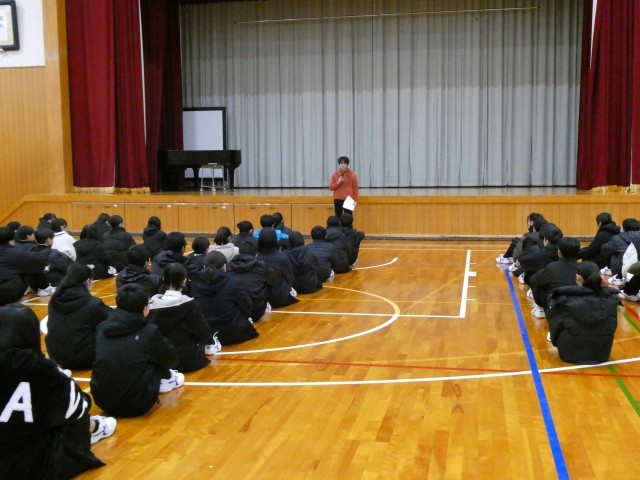 今朝は、生徒朝会が体育館でありました。生徒会歌を全校で合唱後、生徒会長から2学期の振り返りの話がありました。そして、6時間目の冬季水明会タイムで行う鬼ごっこのルールを、副会長が説明しました。
