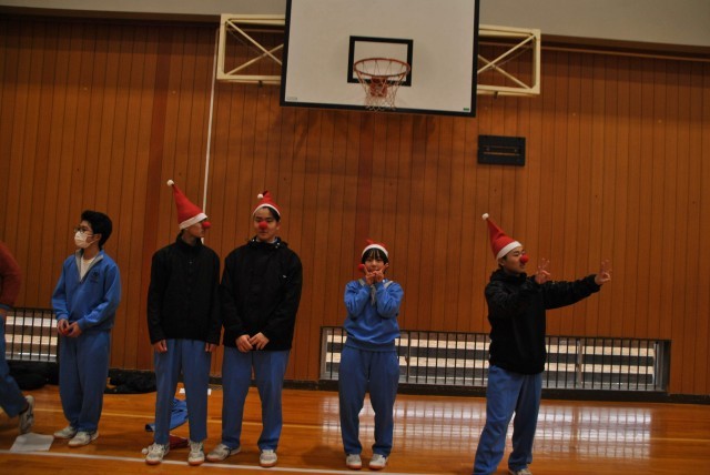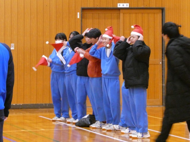 6限の水明会タイムは、初めに本部役員がサンタの帽子をかぶって鬼になり、廊下を逃げる全校生徒を歩いて捕まえました。捕まった生徒は、赤鼻のトナカイのような赤いスポンジを鼻に付けて鬼になっていました。2学期の最後に、生徒会の皆さんの企画で、全校で楽しむことができました。