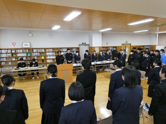 6限に後期水明会総会がありました。議長の進行で、今年度の生徒会本部や各委員会、各部活動の活動報告が行われ、全て承認されました。たくさんの意見や要望が出されて、次年度につなげる会になりました。その後、新生徒会役員と委員長の任命式と引継ぎ式が行われました。今年度のリーダーの皆さん、1年間お疲れさまでした。次年度のリーダーの皆さんは伝統を引き継ぎ、新たな水中を築いていくことを期待します。