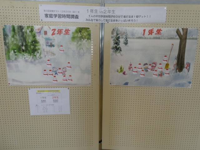 来週20日(金)に行われる1・2年生の第3回定期テストに向けて家庭学習時間調査が玄関ポーチに掲示されています。今回は学年対抗とし、一人の平均学習時間が1時間で一つの雪だるまが貼られていきます。今のところ、わずかに1年生がリードしているようです。どちらも負けずに学習時間を増やしてほしいです。