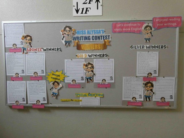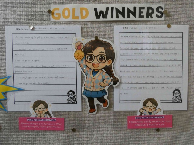 1年生は、英語の時間に定期テストが返却されました。間違えた箇所の確認や解説をしっかりと聞いていました。また、東階段のイングリッシュボードには、1年生が英語の授業で取り組んだ「ライティングコンテスト」の結果が掲示してありました。金・銀・銅賞の「マイベストメモリー」の英文が掲示され、ALTからのコメントもつけられていました。どの英文も立派ですばらしかったです。