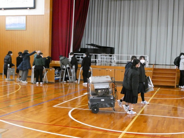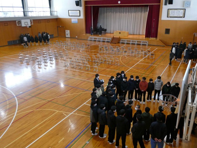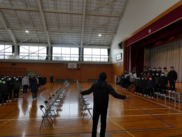 6限に全校式練習の2回目を行いました。今回は、全校合唱を練習しました。全体で声出しの後、パート別に分かれて練習し、最後に全体で合わせました。来週末の卒業式で、最高のハーモニーが聞けることを楽しみにしています。また、準備を2年生が、練習後の後片付けは1年生が行いました。卒業生のために、在校生が協力して頑張りました。