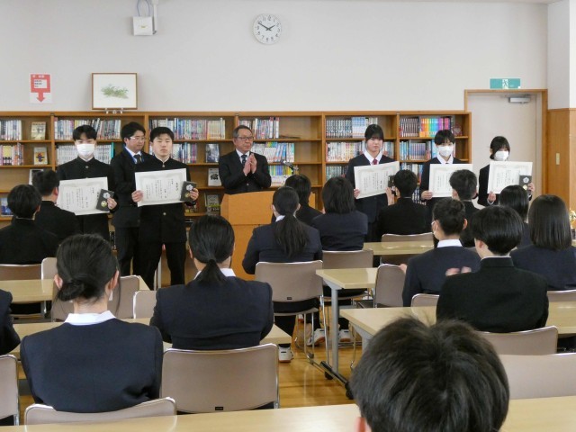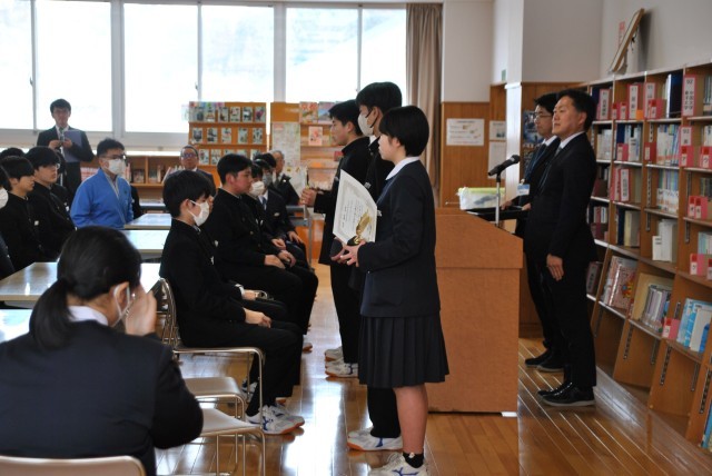 午後、ランチルームで年度末表彰を行いました。これは、生徒の努力を称え、今後の生活を充実させる励みとして、長年水沢中学校で続いています。最初に、マラソン賞の表彰を行いました。校内マラソン大会で、3年間10位以内の成績を収めた4名の生徒に賞状とトロフィーが授与されました。次に功労賞として、県総体バスケットボール大会、県模型展で入賞した生徒とに、同窓会長から賞状とトロフィーが授与されました。表彰を受ける生徒もそれ以外の全校生徒も立派な態度で感心しました。