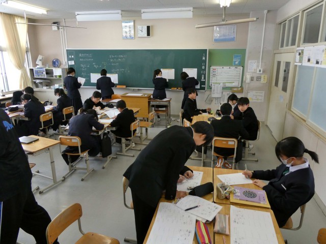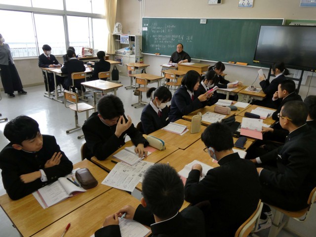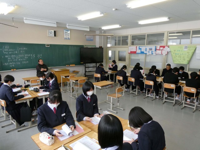 1年生は数学の時間に、式と数の乗除やいろいろな計算の復習をしました。課題プリントにそれぞれが取り組み、分からない問題を班で教え合っていました。1年生の復習をしっかりして、次年度に備えてほしいです。