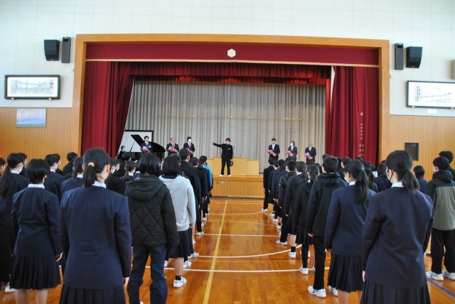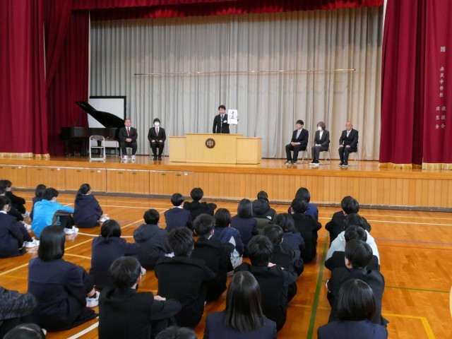 朝、離任式を行いました。人事異動で6名の先生方が水沢中学校を去ることになりました。生徒は、先生方の最後の話をいい姿勢でしっかりと聞いていました。代表生徒のお礼の言葉、花束贈呈後に校歌斉唱をしました。最後は、全校で花道を作って送り出しました。6名の先生方、大変お世話になりました。ありがとうございました。