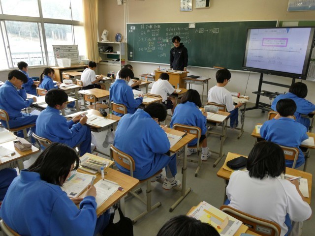 1年生は、数学の時間に正の数、負の数について学習しました。陸上の記録やゴルフのスコア、気温、標高と海抜などから、プラスとマイナスという考え方について全体で確認しました。確認後には、各自で問題に取り組み、理解を深めました。