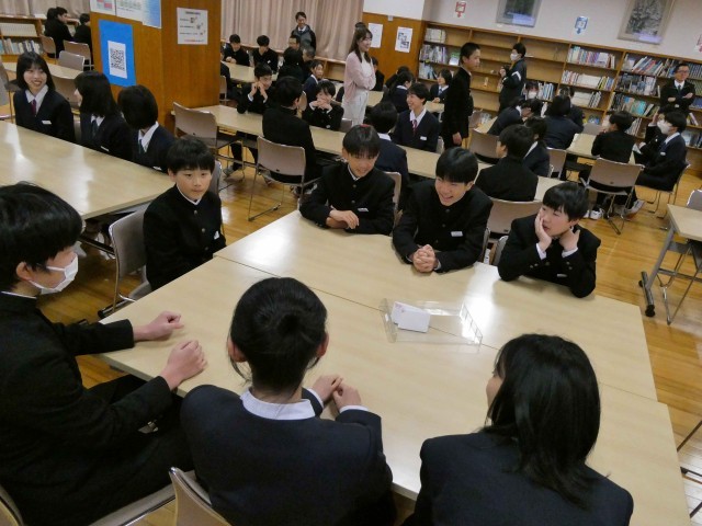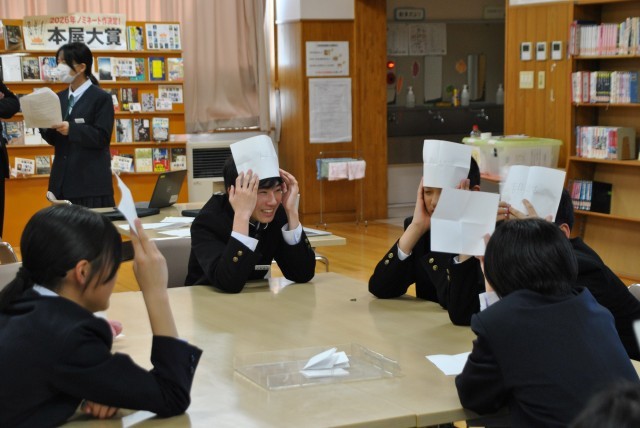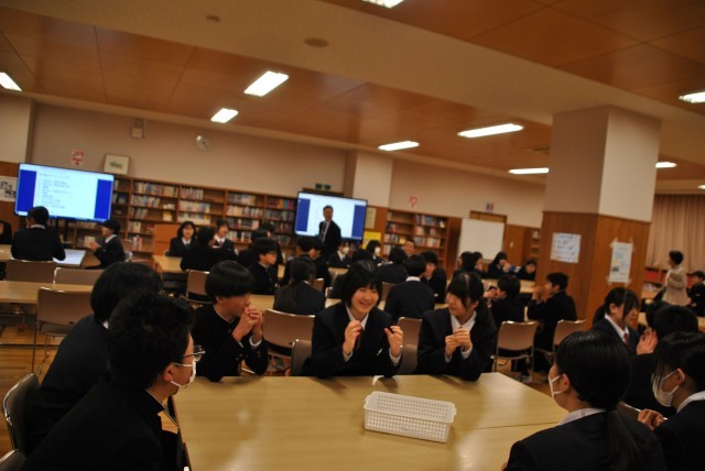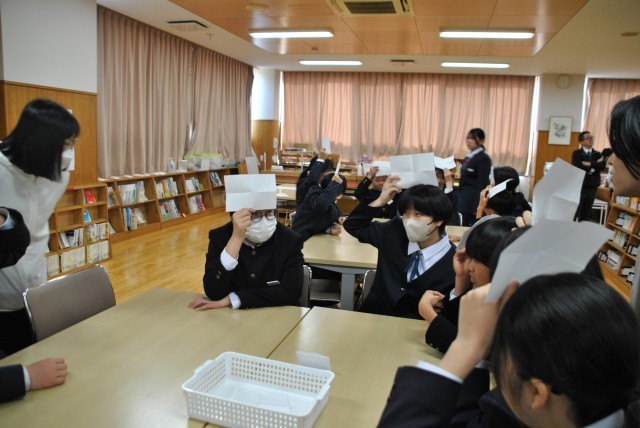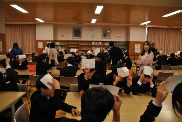 最初は自己紹介ゲームと題して、発表者が好きな食べ物などの自己紹介を5つ発表する中で、うその内容1つを班員が相談して当てるゲームでした。次のゲームは、NGワードゲームです。班員全員が用意された用紙を一枚引き、自分は見ないで頭の上に掲げて班員同士が会話の中で互いの言葉を言わせるゲームでした。会話を深め、笑顔で交流する姿が多くの班で見られました。