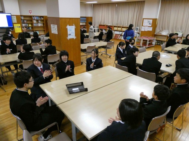 今朝は、生徒朝会がランチルームでありました。全校で生徒会歌を歌った後に、水明会タイムとして、11の縦割り班が班員とレクリエーションで交流を深めました。