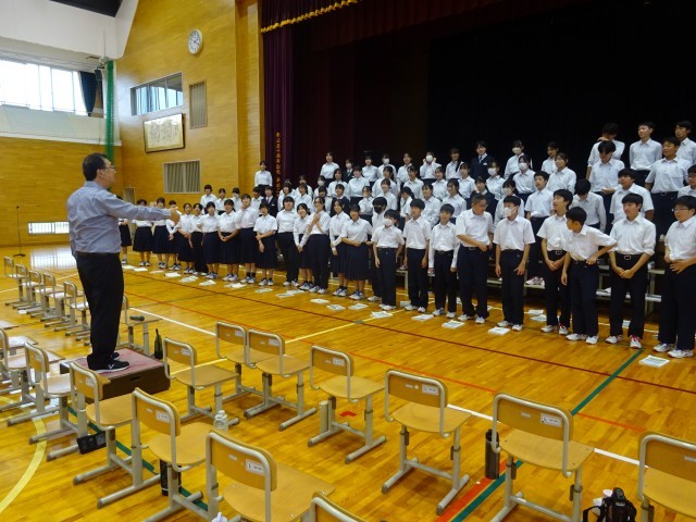今回は全校合唱のご指導。立ち方や身体の使い方、そして声の出し方等を丁寧にご指導いただき、見違えるように歌がよくなりました。