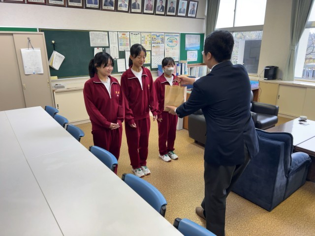 ふれあいの丘支援学校の在校生が持参して下さり、生徒会役員が受け取りました(画像1)。