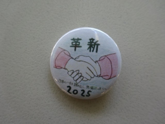 今年は生徒会スローガン「革新」を中央に、握り合う手がデザインされたバッジになりました。