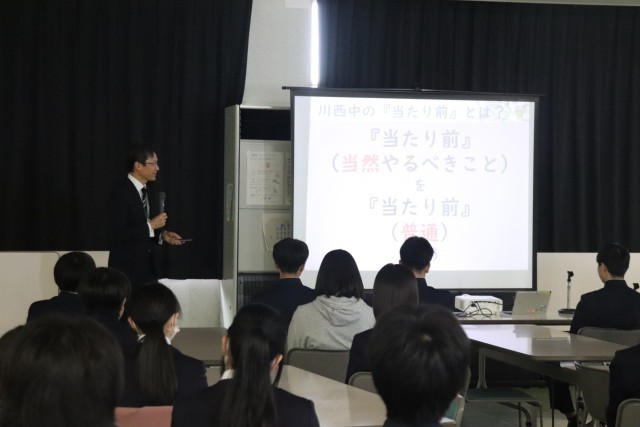 校長からは、「当たり前(普通でありふれていること)」と「有難し(希少でめったにないこと)」の違いをスタートに、「当然・普通」に感謝できることの大切さについて伝えました。