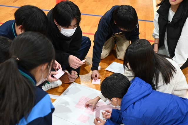 中学生がファシリテーターを行いながら話合いを行いました。それぞれのグループでいじめについて真剣に考えていました。