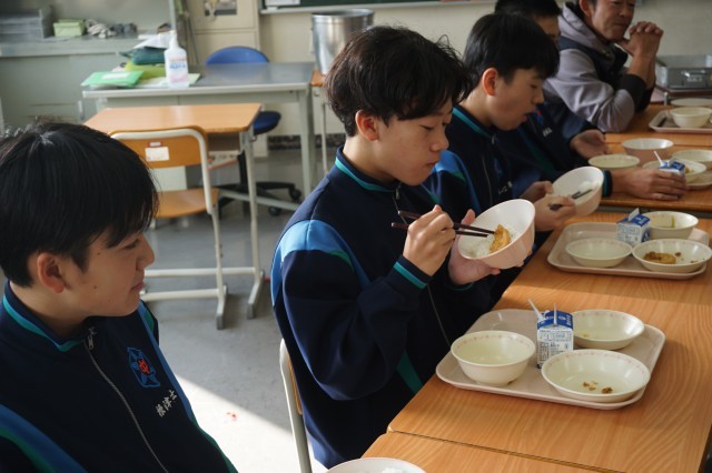 早速生徒は釜川大地育みの会の皆様と一緒に愛情の籠った中里産コシヒカリを味わい、『おいしい』『もちもちしている』と感想を述べていました。