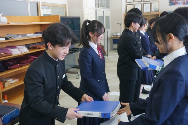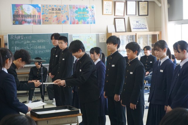 その後、委員長の任命式を行い、引継ぎ式を行いました。3年生のリーダーは1・2年生のリーダーに使用していたファイルを渡す際に、安堵の表情と共に、感慨深い思いになっていました。