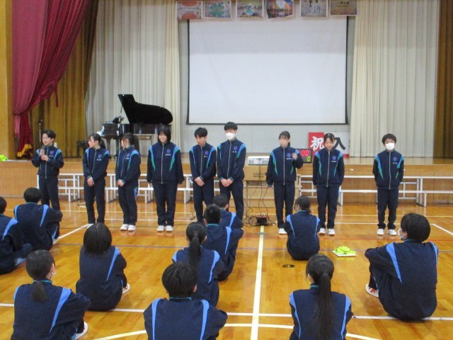 最後に、3年生担任にミッションが課され、無事成功してハンター放出を阻止しました。終礼では、新生徒会本部役員が全校の前で来年度の抱負を語り、次年度への期待が高まりました。頑張った現生徒会本部役員の皆さん、お疲れさまでした。