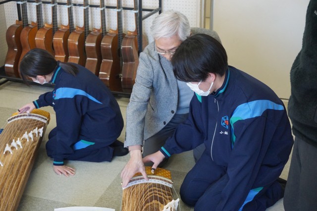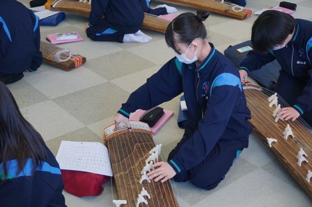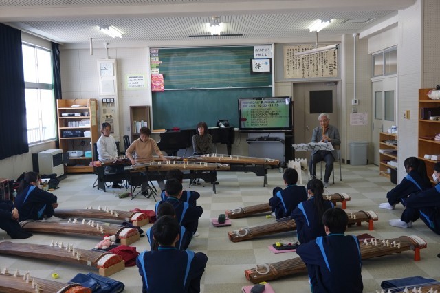 18日(水)に和楽の会の4名の皆様より箏の指導をしていただきました。最初に素敵な演奏を披露していただきました。その後、演奏する際の位置や指の使い方まで丁寧に教えていただき、最後に全員でさくらを弾き、音楽室に美しい音色が広がりました。最初に比べると音が安定して、練習の成果がはっきりと分かりました。素敵な時間をありがとうございました。