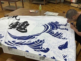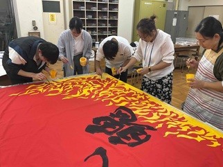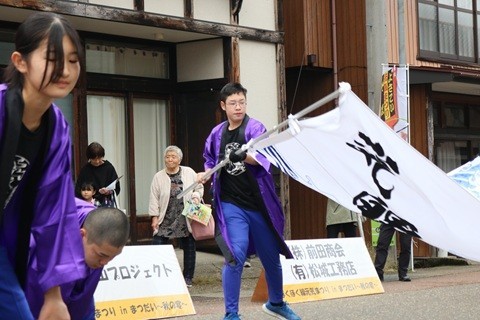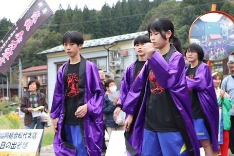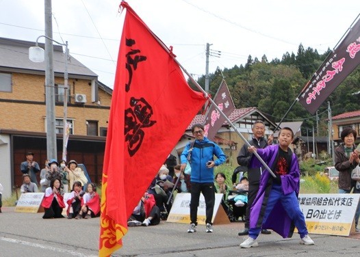10月19日(日) 地域行事「ほくほく線元気まつりinまつだい~秋の宴~」に、今年も全校生徒で参加しました。体育祭で踊った「よさこい」を地域の方や来場した観覧者の皆様に披露いたしました。みんなの踊りで元気づけられたと思います。今年から「よさこい」らしく大旗も加えました。この日に合わせ、当校の技術科の松山雄太さんに大旗をデザイン及び手描きで製作してもらいました。職員もその一部を手伝いました。