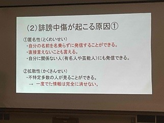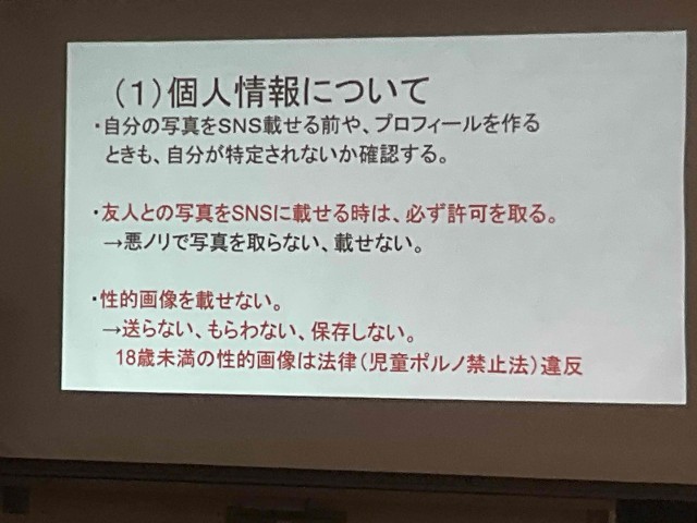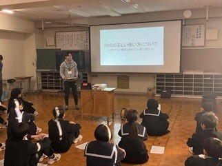 12月19日(金)全校集会にて「冬休み前のSNS指導」を行いました。中高生の間でSNSを使用した誹謗中傷や個人情報の流出など心配されているため、個人の時間が増える冬休みを前に、SNSの使用にあたって注意すべきことや意識を高くもってもらいたいことについてお話をしました。