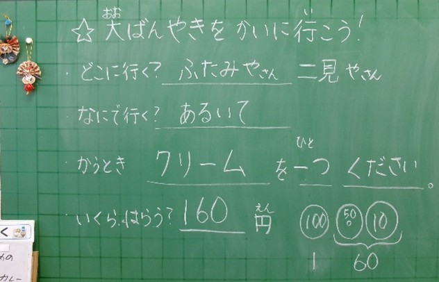 中学部は、書初めをしました 1月13日、快晴の中、小学部は、スキーウェアに身をつつみ、地域のお菓子屋さんへ買い物学習に行ってきました。自分で、歩いてお店に行き、買いたいものを伝え、お金を払って、手にしたホカホカの大判焼きは格別でした!午後からは、ぐんぐんタイムで雪遊びが始まりました。14日には体育でそり遊びが始まります。