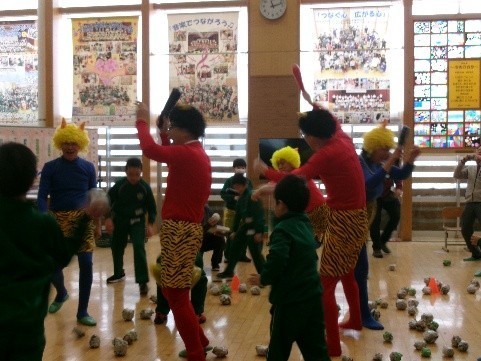2月3日、小学部「豆まきお楽しみ会」がありました。十日町ライオンズクラブの17名の方々からお越しいただき、豆まきをしたり、一緒に歌を歌ったりしました。