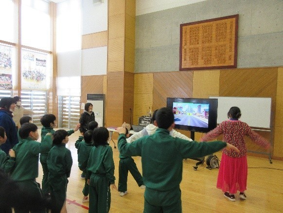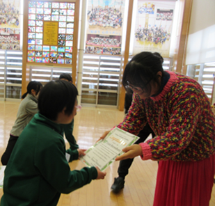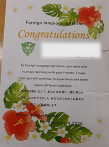 2月9日、今年度の外国語活動最終日でした。ALTのアリッサ先生とJTLの小林先生からは、今年度は5回らいこうしていただきました。その時期に合わせたダンスやクイズをしたり、楽しい仮装をして教えてくださったり、子どもたちは楽しく外国語を学ばせていただきました。ありがとうございました。最後に一人ずつ終了証を手渡され、子どもたちは嬉しそうに眺めていました。アリッサ先生の笑顔で、外国語や外国の文化がより身近に感じられました。