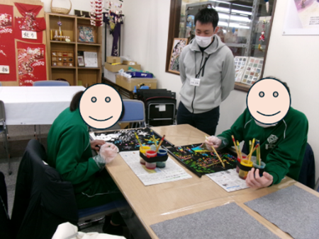 19日に、(株)翠山で、タペストリーの友禅染めを体験しました。生徒たちは、自分の好きな柄を選び、思い思いに色付けしていきました。「日本の伝統ってすごいですね。」「早く家に持ち帰りたい。」という言葉も聞かれ、楽しみながら伝統美に触れる機会となりました。
